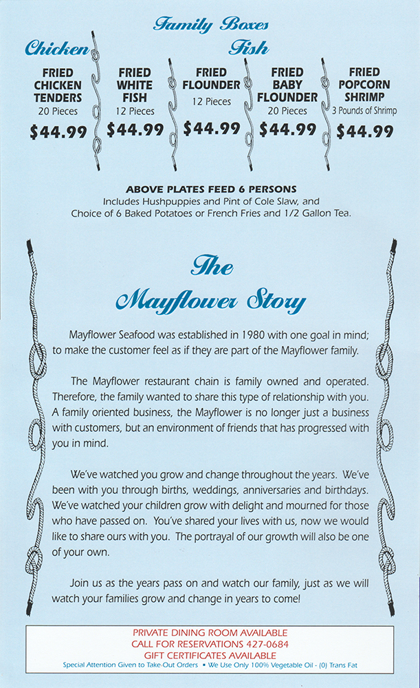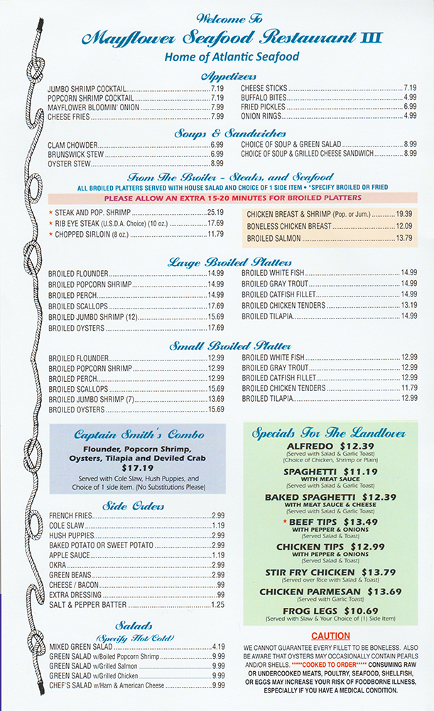 Mayflower III Seafood Restaurant, located in the Midtown Commons in Madison, North Carolina offers a beautiful, relaxing atmosphere so you can enjoy your meal while dining with us. The building is decorated with hand painted murals throughout to give you the true coastal feeling. Mayflower is known for its famous seafood with large selections to choose from. They also offer entrees such as rib eye steaks, chopped sirloins, chicken tips, beef tips, spaghetti, and a variety of other choices. Please stop by to dine with us. We are sure you will like it.