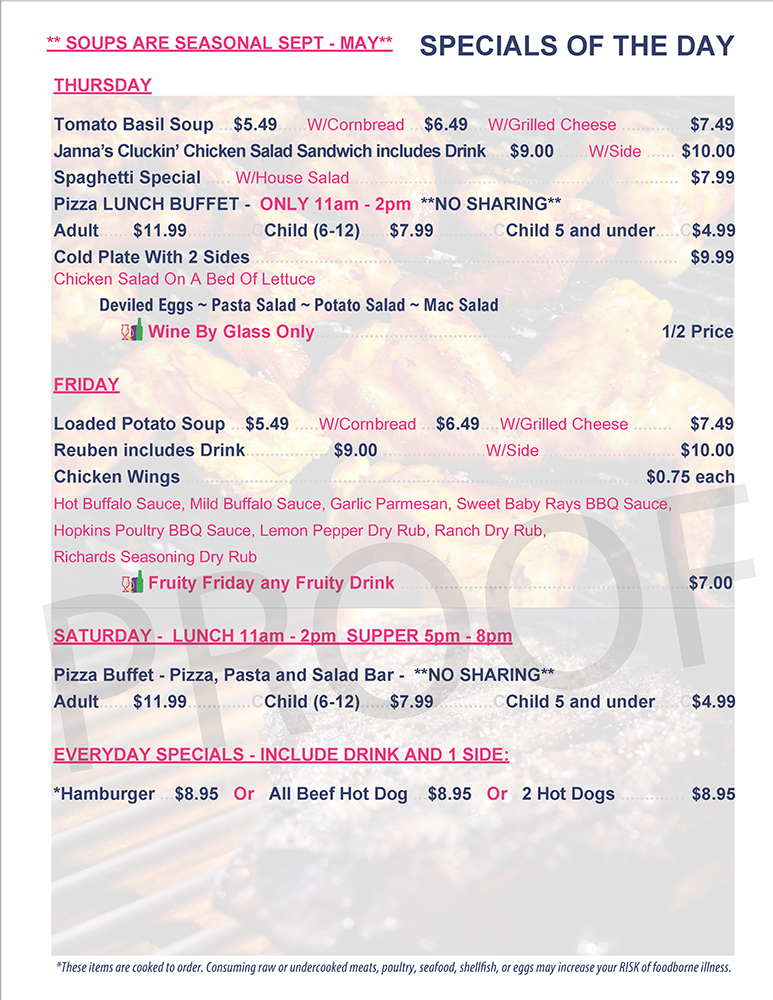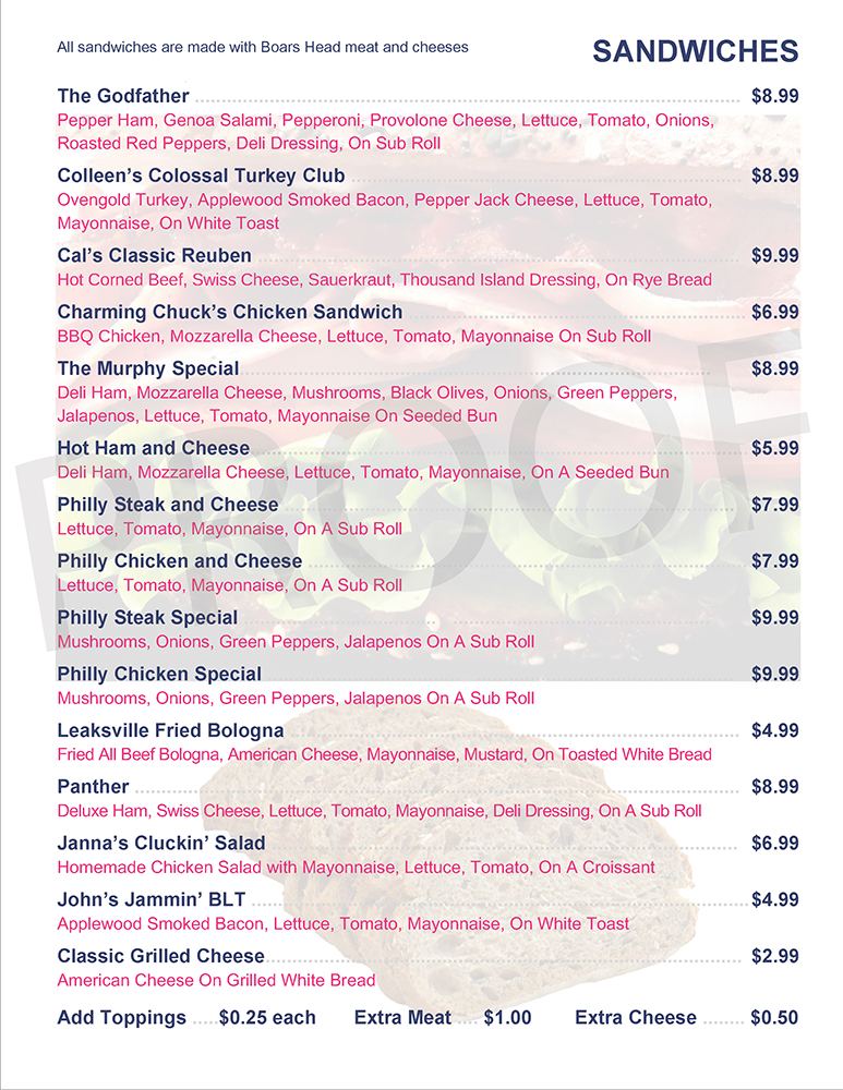 A full service restaurant is available with multiple dining rooms. We offer Burgers, Hot Dogs, Deli Sandwiches, Chicken Salad, Salads, and more. See our menu below.