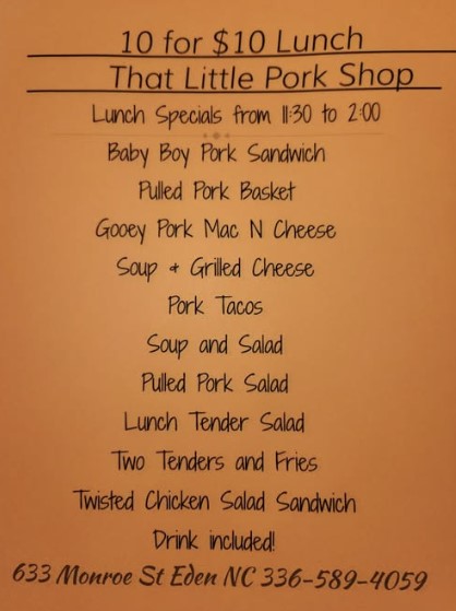 That Little Pork Shop opened its doors in January, 2019. If you like anything pork, you will love this place. We offer pulled pork sandwiches, pork quesadillas, pork salads, pork tacos, ribs, pork chop sandwiches, BBQ hushpuppy balls, bacon and more. We let you choose from 11 different BBQ sauces to suit your taste. And if you don't like pork, we have chicken, salads, shrimp, burgers, kids meals and a lot more. Check out our menu below and please come dine with us.