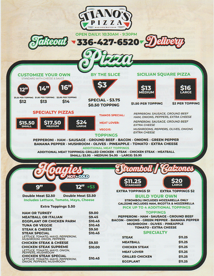 Tiano's Pizza offers a family friendly atmosphere, decorated with beautiful hand painted murals of Italy along the walls. Stop by and enjoy a meal with us.