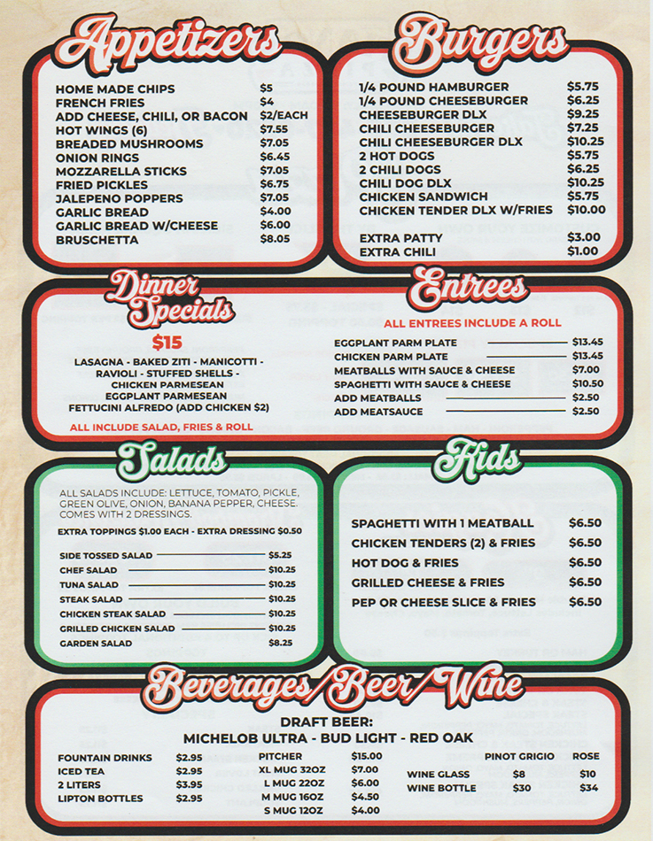Pizza, Strombolis, Sub, Sandwiches, Salads, Burgers and more.
